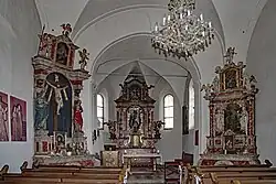Alle drei neobarocken Altäre stammen aus dem 19. Jahrhundert. Der Hochaltar birgt in der Mittelnische eine Statue des heiligen Michael, in der Aufsatznische die einer Maria Immaculata. Seitlich stehen Leuchterengel bzw. anbetende Engel. Der linke Seitenaltar zeigt eine Kreuzigungsgruppe vor einem gemalten Jerusalem. Im Aufsatzbild ist Gottvater dargestellt. Die Engelfiguren am Altar tragen Leidenswerkzeuge. Das Altarblatt des rechten Seitenaltars aus der zweiten Hälfte des 18. Jahrhunderts stellt den Gang der Heiligen Familie über das Gebirge dar. Seitlich stehen die Figuren der Heiligen Katharina und Barbara. Auf der Mensa steht ein kleines Madonnenbild im Rokokorahmen.