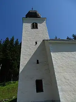 Der kräftige Turm mit quadratischen Grundriss ist im Nordosten an das Kirchenschiff und den Altarraum angebaut. Er ist wie das Kirchenschiff in seiner Gestaltung einfach gehalten und wird durch gemalte Fenster- und Türrahmen sowie Eckquaderungen gegliedert. Das Turmdach ist als ein mit Schindeln aus Lärchenholz gedeckter Zwiebelhelm ausgeführt. Auf eine Turmkugel auf der Spitze des Turmes ist ein Kreuz mit zwei Querbalken aufgesetzt. Im Nordosten führt ein ebenerdiger Eingang in das Erdgeschoß des Turmes. Über der Tür befindet sich ein schmales Rechteckfenster. Ein weiterer, erhöht gelegener Turmzugang liegt an der südöstlichen Seite; er ist über eine überdachte Außentreppe aus Holz erreichbar. Über dem Zugang befindet sich ein schmales Rechteckfenster. An der Nordwestseite gelangt im Erdgeschoß durch ein rechteckiges Fenster Licht in das Turminnere. Auf dieser Seite kommt außerdem durch zwei übereinander liegende schmale Rechteckfenster Licht hinein. Je ein Rundbogenfenster auf jeder Seite im obersten Turmgeschoß ist mit Balken verschlossen.[9][6][7]