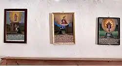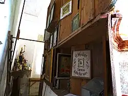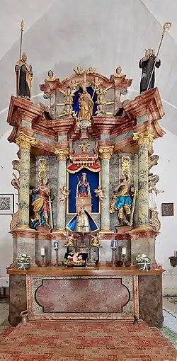 Ein mit Öl auf Holz gemaltes Bild der heiligen Kümmernis rechts vom Hochaltar an der Rückwand des Altarraumes wurde im späten 18. Jahrhundert oder der ersten Hälfte des 19. Jahrhunderts geschaffen. Das Bildnis wurde möglicherweise von der Darstellung der Heiligen im Buchhaus in Geistthal beeinflusst. Die Heilige ist in dem 36 Zentimeter hohen und 26 Zentimeter breiten Bild in ihren Kleidern ans Kreuz genagelt dargestellt. Vor dem Kreuz kniet ein Geiger, den Kopf zur Gekreuzigten hin erhoben. Ein Marmorrelief im rechten Bereich an der südöstlichen Mauer des Altarraumes zeigt eine Darstellung des Fegefeuers und stammt vermutlich aus der Zeit um 1670.[9] An derselben Mauer hängen unterhalb des Fensters je ein Bild mit einer Darstellung des Herz Jesu und des Unbefleckten Herz Mariens. Zwischen diesen beiden Bildern ist eine steinerne Gedenktafel zur Erinnerung an den 1943 bei Woroschilowsk gefallenen Vinzenz Ulz angebracht. Unter der Gedenktafel hängt ein in Farbe ausgeführtes Bild der Betenden Hände von Albrecht Dürer. Auf der rechten Seite des Altarraumes, links vom Pilaster, der den Übergang vom Langhaus zum Altarraum bildet, steht ein kleiner Altar mit einer Statue des heiligen Rochus. Dieser Altar und die Statue wurden im August 1897 von den Arbeitern der zwei in der Nähe gelegenen Marmorsteinbrüche des Franz Grein aufgestellt.[5][10][6]