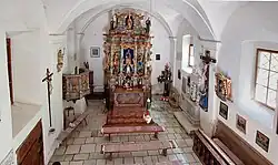 Die dreijochige Saalkirche wird von einem auf Gurten ruhenden Kreuzgratgewölbe überspannt. Einfache Pilaster mit Gesimskapitelle gliedern die Wände. Das nordöstliche Joch der Kirche ist als Altarraum gestaltet. Die hölzerne Empore an der südwestlichen Wand des Langhauses wurde um 1860 errichtet. Sie ist über eine Wendeltreppe in der südwestlichen Ecke des Langhauses zugänglich. Über diese Wendeltreppe gelangt man durch eine Öffnung auch zum Dachboden über dem Langhaus. An der Rückseite des Altarraumes, hinter dem Hochaltar führen eine Tür sowie eine darüber gelegene rechteckige Öffnung in den Turm.[9][5]