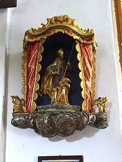 An dem Pilaster am Übergang vom Langhaus zum Altarraum hängt ein großes Kruzifix mit einer Darstellung der Mater Dolorosa. Neben dem Kruzifix ist an der südöstlichen Langhausmauer unter einem Baldachin eine Figur des heiligen Wolfgang von Regensburg im Bischofsornat und mit einem Kirchenmodell in der Hand angebracht. An derselben Wand hängt ein Bild des heiligen Paulus. Am Pilaster rechts des Bildes steht eine Figur, die vermutlich den Apostel Johannes darstellt. Auf dieser Seite des Langhauses hängen insgesamt fünf Votivbilder. Auf der gegenüberliegenden linken Seite steht am Pilaster am Übergang zum Altarraum eine Figur des heiligen Johannes des Täufers mit einem Kreuzstab. Neben der Johannesfigur hängt ein Kruzifix über einem Weihwasserbecken. Links neben der Tür des Seiteneingangs weist die Inschrift einer Tafel auf die Restaurierung der Kirche von 1975 hin. Eine Figur über der Tafel stellt den heiligen Wendelin dar. Am Pilaster links der Statue steht eine Figur, die vermutlich die heilige Maria zeigt. Links von dieser Figur hängt ein großes Votivbild mit der Gründungslegende der Kirche. Die meisten Figuren im Langhaus stammen aus dem Barock.[5][6]