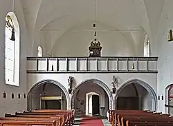 Im dreijochigen Langhaus befand sich wohl ursprünglich ein Kreuzrippengewölbe. Jetzt ruht ein Tonnengewölbe mit Stichkappen auf gotisch profilierten Wandvorlagen. Die dreiachsige, spätgotische Westempore ist kreuzrippenunterwölbt und an den Schlusssteinen mit Wappenschildern versehen. Die Emporenbrüstung ist durch vorgeblendete Stäbe in 13 Felder unterteilt. Ein profilierter Triumphbogen verbindet das Langhaus und den Chor mit Fünfachtelschluss und einem Netzrippengewölbe. Chor und Langhaus haben zweibahnige Maßwerkfenster. In der barocken, kreuzgewölbten Kapelle nördlich des Chores ist die Gruft des Michael von Pughelsheim († 1688) untergebracht. Ein spätgotisches Kielbogenportal führt vor dem Triumphbogen an der Nordseite des Langhauses in die Sakristei.