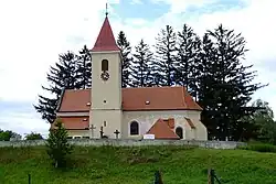 Die Kirche liegt auf einer am nördlichen Ortsrand gelegenen Anhöhe. Das Gotteshaus wird von einem Friedhof mit Umfassungsmauer umgeben. Das Friedhofsportal weist Rundbogenzinnen auf.[2]