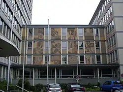 Die Fassade des Zwischenbaus wurde durch Hans Härtel malerisch gestaltet. Er entwickelte 1954 ein Farbkonzept, das sowohl Außen als auch Innen umgesetzt wurde. Dabei wurden Themen rund um das Thema Geld aufgegriffen. Eine Besonderheit stellt ebenfalls der Paternosteraufzug im Finanzamt dar. Er ist seit dem Bau des Gebäudes in Betrieb und ist der letzte verbliebene Aufzug dieser Art in Augsburg.
