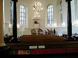 Das Kircheninnere erweckt den Eindruck gewünschter Einfachheit und Freundlichkeit. Die Wände als auch die Kanzel sind in hellen Farben gehalten. Die hinter dem Abendmahlstisch mit seitlichem Zugang angebrachte Kanzel ruht auf einem Fundament, das einen Pelikan darstellt.