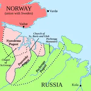 Die Provinz Petsamo (russisch Petschenga) westlich der Halbinsel Kola, die Finnland von der Sowjetunion durch die Friedensverträge vom 14. Oktober 1920 und vom 12. März 1940 freiwillig abgetreten worden war, kam 1944 zur Sowjetunion.