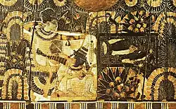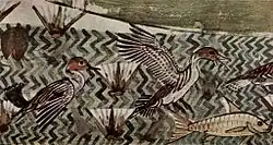 Gegessen wurden zeitweise Schildkröten. Die wirtschaftlich bedeutendste war die Nilweichschildkröte. Sie kam im Nil zahlreich vor und erreichte eine beachtliche Größe; so hatte beispielsweise der Rückenpanzer einen Durchmesser von bis zu 120 Zentimetern. Möglicherweise wurden die Rückenpanzer in vorgeschichtlicher Zeit als Schilde benutzt, doch ist das bislang nicht bewiesen.[15] Im Mittleren Reich wurde der Verzehr von Schildkröten beendet. Sie wurden als Gegner des Sonnengottes Ra angesehen, den sie bei dessen nächtlichen gefährlichen Fahrten durch die Unterwelt in seiner Barke als Tiere der geheimnisvollen Tiefen bedrohten. Doch fanden noch manche Teile der Schildkröte in der Medizin Verwendung. An vielen Stellen finden sich Wandbilder, so in den Tempeln von Philae, Edfu oder in Dendera, auf denen Pharaonen bei der rituellen Jagd und Tötung von Schildkröten gezeigt werden.[16]