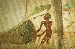 Neben dem Gebrauch von Speeren ist das Fischen mit Netzen das am häufigsten dargestellte Motiv auf Abbildungen. Die einfachsten Netze waren Handnetze und Kescher. Die Menge der abgebildeten Fische ist vermutlich eine künstlerische Übertreibung, die vor allem dazu diente, viele verschiedene Fischarten darzustellen. Weitaus aufwändiger, aber wohl besonders ertragreich war des Fischen mit großen Zugnetzen („Wadenfischerei“). Diese Art der Fischerei ist mindestens in 78 Gräbern des Alten Reiches gefunden worden, weshalb diese Fangmethode recht gut rekonstruierbar ist. Schwimmer und Gewichte hielten die Netze von unterschiedlicher Länge, die an Ober- und Unterkanten mit Leinenstreifen eingefasst waren, in senkrechter Lage. Die Schwimmer waren aus Rohr oder Holz hergestellt, die Senker aus Stein, möglicherweise auch aus Ton und in späterer Zeit aus Blei. Die Senker sind, anders als die aus pflanzlich Materialien bestehenden Schwimmer, durch archäologische Funde noch heute zu sehen. Selbst von Netzen haben sich einige Stücke erhalten.[25] Das Maschenwerk wurde aus Papyrus, Flachs oder anderen Pflanzenfasern gefertigt. Die Netze waren mit Weberknoten unverschiebbar zusammengeknüpft. Die Maschenweite war mit höchstens 1,9 cm sehr klein. Somit mussten die Netze beim Ziehen durch das Wasser einen erheblichen Widerstand erzeugt haben. Es wurden demnach für diese Art des Fangens viele Fischer benötigt. Auf einem Grabbild sind 28 Männer und ein Vormann dargestellt. Es scheint auch schon Schleppnetzfischerei gegeben zu haben. Im Grab des Mektirê wurden die Modelle zweier Papyrusboote gefunden, zwischen denen ein Netzsack angebracht war. Wurfnetze wurde offenbar erst seit römischer Zeit benutzt, was vor allem deshalb verwunderlich ist, weil diese Art der Fischerei in Mesopotamien schon lange bekannt war.[26]