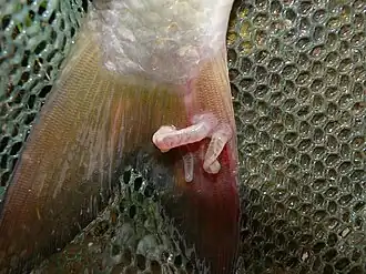 Cystobranchus respirans an einem Rotauge | ||||||||||||