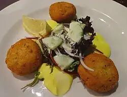 Fischsalate sind Zubereitungen aus zerkleinerten Fischerzeugnissen, Gemüsen, Obst, Gewürzen und Soßen. Als Soßen sind Mayonnaise, Salatmayonnaise, andere emulgierte Zubereitungen üblich, wahlweise aus Speiseöl, Essig, Sahne, Joghurt, Crème fraîche und anderen geschmackgebenden oder den Genusswert erhöhenden Zutaten. Mit Mayonnaise hergestellte Fischsalate werden den Feinkostsalaten zugerechnet. Salate mit Fleisch von Fischen werden in den Leitsätzen für Feinkostsalate beschrieben.[4][5]