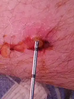 Eine mögliche Komplikation ist die Infektion der Weichteile und der Bohrkanäle.