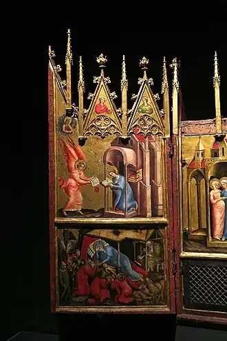 Der Altar zeigt in geöffnetem Zustand einen Marienzyklus, beginnend mit der Verkündigung am linken Flügel oben.[3] Der Zyklus setzt sich fort an den Nischenflügeln mit Szenen von der Heimsuchung und der Geburt Christi, dann mit der Anbetung der Könige wieder am linken Flügel sowie abschließend am rechten Flügel mit dem Tod und der Krönung der Muttergottes. Es sind insgesamt sechs Altarbilder, die das Leben Mariens erzählen. In den Wimpergen befinden sich die Brustbilder der Heiligen Katharina, Ursula, Margarete und Elisabeth. In der leeren Mittelnische stand ursprünglich eine Skulptur, die verloren gegangen ist. Sie bildete das Zentrum des Flügelaltars. Es wird angenommen, dass es eine sitzende Madonna mit Kind war.