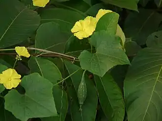 Laubblätter, Blüten und unreife Frucht von Luffa acutangula var. amara | ||||||||||||