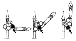 Geschlossenes französisches Flügelsignal. Der Drehpunkt befindet sich in der Mitte des Flügels.