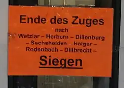 Hinweistafel im Zug Bis zum Fahrplanwechsel 2006 wurde bei einigen mit herkömmlichen Doppelstockwagen-Zügen gefahrenen Regional-Express-Zügen von Frankfurt am Main nach Siegen und Treysa in Gießen geflügelt. Bei diesem Beispiel wurde die Fahrgastinformation mit einfachen Mitteln durchgeführt: kreidebeschriftete Tafeln markierten die Trennstelle am Bahnsteig, Klebezettel am Wagenübergang markierten sie im Zug. Heute wird in Gießen der mit Triebzügen gefahrene Mittelhessen-Express geflügelt. Ein Teil fährt weiter nach Treysa, der andere nach Dillenburg. Seit Dezember 2010 finden in Gießen darüber hinaus Flügelungen auf der Linie RE 98/RE 99 statt. Der hintere Zugteil fährt weiter nach Siegen (Main-Sieg-Express), der vordere nach Kassel.