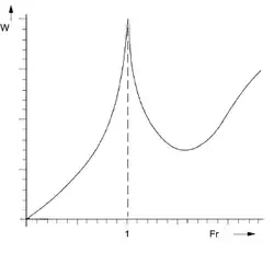 Bei Schiffen, die im strömenden Strömungszustand (), also bei einer Schiffsgeschwindigkeit kleiner als der Schwallwellengeschwindigkeit fahren, herrscht unter dem Schiffsboden ein strömender Abfluss und die Fahrt wird als unterkritisch bezeichnet. Das Absinken des Schiffes aufgrund der schnelleren Strömungsgeschwindigkeit sowie die gleichzeitige Vertrimmung wird als Squat bezeichnet. Der Widerstand wächst proportional zur Schiffsgeschwindigkeit, wobei bei einem kritischen Abfluss () ein Widerstandsmaximum gebildet wird. Beim Schießenden Strömungszustand () wird die Unterströmung schießend, der Widerstand verringert sich. Schiffe, die schneller als Schwallgeschwindigkeit fahren, nennt man überkritisch.[3] Übliche Handelsschiffe besitzen meist keine so große Maschinenanlage um das Widerstandsmaximum zu überwinden. Der Effekt des Flachwasserwiderstandes auf die Unterströmung unter dem Schiffskörper ist gleichzeitig das Hauptkriterium für die Erosionen an Gewässersohlen.[4]