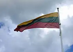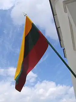 Flagge Litauens seit 2004Mit der Französischen Revolution wurden Trikoloren populär.[1] Die traditionellen litauischen Farben waren Weiß und Grün, die der Vytis-Flagge Rot und Weiß. Somit boten sich Rot, Weiß und Grün als Nationalfarben an. Sie wurden ab 1829 von litauischen Studenten an der Universität von Königsberg und ab 1885 von der Birute-Gesellschaft verwendet. Diese Farbzusammenstellung war aber nicht populär, da sie auch im ostpreußischen Kleinlitauen üblich war. Deshalb wurden oft Flaggen gezeigt, bei denen Rot und Grün durch einen schmalen gelben Streifen getrennt waren. Nach der Unabhängigkeitserklärung im Jahr 1918 wurde eine Kommission eingesetzt, die eine Nationalflagge entwerfen sollte. Da dieser Kommission, bestehend aus Jonas Basanavičius, Tadas Daugirdas und Antanas Žmuidzinavičius, Karminrot und Dunkelgrün als zu trist erschienen, fügte sie nach langen Beratungen den gelben Streifen hinzu. Als Seitenverhältnis wählte man 2:3. Ab Mitte der 1920er-Jahre wurden Rot und Grün heller dargestellt. Die Flagge Kleinlitauens wurde weiter zwischen 1920 und 1939 als Flagge des Memel-Distrikts verwendet.