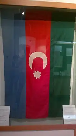 Am 21. Juni 1918 nahm das aserbaidschanische Parlament eine auf Basis der Osmanischen Flagge geschaffene Nationalflagge an, die den „türkischen Charakter“ der neuen Republik ausdrücken sollte. Diese neue Flagge bestand aus einem roten Grundtuch, dem mittig ein weißer Halbmond und ein achtzackiger Stern aufgelegt war. Der Halbmond symbolisierte nach damaliger Auffassung den Islam und der achtzackige Stern sollte die acht perso-arabischen Buchstaben darstellen, aus denen der Name Aserbaidschan (persisch آزربيجان, DMG Āzarbāiǧān) gebildet wurde. Doch bereits am 9. November 1918 genehmigte das Parlament die Einführung einer neuen Flagge, die auf Basis des 1917 vorgestellten Design beruhte. Einige Varianten dieser Flagge führten bereits damals den Halbmond und Stern nur im roten Streifen. Dieser lag entweder in der Flaggenmitte oder war zum Liek versetzt.[3]