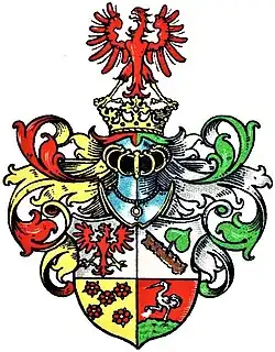 Blasonierung: Quadriert. Feld 1 in Silber ein roter rechtssehender Adler. In Feld 2 in Silber ein schräger brauner Ast mit einem grünen Blatt. In Feld 3 in Gold fünf (2:1:2) rote Rosen. In Feld 4 in Rot auf einem grünen Berg ein silberner Kranich, der den rechten Fuß in die Höhe hebt, rechtsgewandt. Auf dem gekrönten Helm der rote Adler. Die Helmdecken sind rechts rot-golden und links grün-silbern.[3]