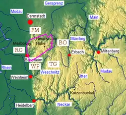 - ↑ Nickel, Erwin: Odenwald – Vorderer Odenwald zwischen Darmstadt und Heidelberg. (= Sammlung geologischer Führer 65) 2. Auflage. Borntraeger, Berlin 1985, ISBN 3-443-15024-1, S. 5 ff.