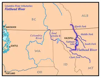 ![]() Karte des Flathead Rivers, seiner Zuflüsse und der Verbindung zum Columbia River über Clark Fork und Pend Oreille River | ||