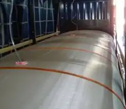 Für den Transport im Lkw-Auflieger wird eine Antirutschmatte verlegt, um die Ladungssicherung zu gewährleisten. Mit Spanngurten wird der Flexitank zusätzlich gesichert, um auch zu verhindern, dass der Inhalt übermäßig schwappen kann.