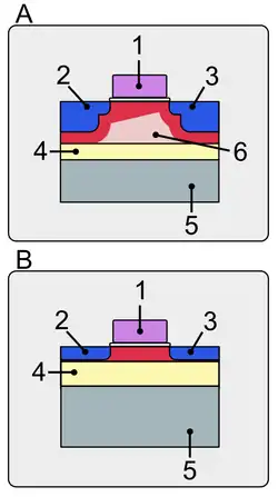 Legende: 1. Gate-Elektrode, 2. Source, 3. Drain, 4. Isolator, z. B. Siliziumdioxid, 5. Substrat, 6. Body/Bulk