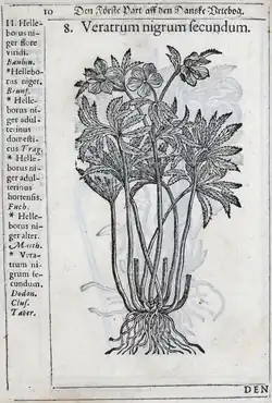 Veratrum nigrum secundum Helleborus niger flore viridi. Bauhin. Helleborus niger. Brunf. Helleborus niger adulterinus domesticus. Trag. Helleborus niger adulterinus hortensis. Fuch. Helleborus niger alter. Matth. Veratrum nigrum secundum. Dodon. Clus. Taber. |