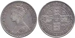 Die ersten Silber-Florins wurden 1849 mit einem Durchmesser von 28 mm und einem Gewicht von 11,3 g geprägt. In ihrer Umschrift fehlten sowohl das auf britischen Münzen übliche D.G. für dei gratia (von Gottes Gnaden) als auch das F.D. für fidei defensor bzw. fidei defensatrix (Verteidiger bzw. Verteidigerin des Glaubens). Deshalb ist diese Münze auch als Godless Florin (gottloser Florin) bekannt; weniger oft wurde sie auch als Graceless Florin bezeichnet. Sie war aufgrund der ungewöhnlichen Gestaltung unpopulär und wurde deshalb 1851 durch den Gothic Florin abgelöst, auf dem wieder auf das Gottesgnadentum hingewiesen wurde. Ungewöhnlicherweise wurde bei diesem für die Umschrift eine Gitterschrift verwendet und das Jahr als römische Zahl angezeigt; zudem wurde der Durchmesser auf 30 mm erhöht. Ab 1887 wurden wieder lateinische Schrift und arabische Jahreszahlen verwendet.