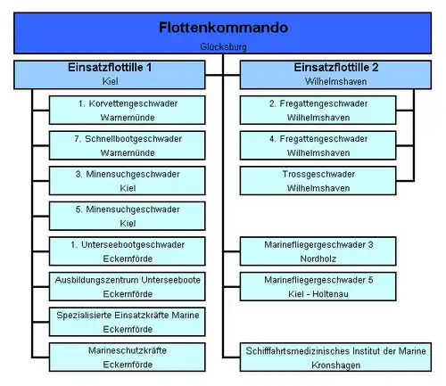 Der Befehlshaber der Flotte war truppendienstlicher und Disziplinarvorgesetzter der ihm unterstellten Dienststellen. Er war verantwortlich dafür, dass die Verbände und Einheiten für Einsätze vorbereitet werden. Dazu gehörten die personelle Besetzung, die Ausrüstung und die Ausbildung. Die der nationalen, truppendienstlichen Führung des Flottenkommandos unterstellten See- und Seeluftstreitkräfte der Marine waren in Einsatzflottillen und Marinefliegergeschwadern zusammengefasst.