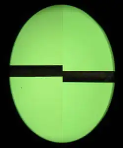 Alternativ hierzu lassen sich die Abweichungen der Maschinenführung auch über die mit dem linearen Messsystem des Prüfgeräts verbundene Digitalanzeige ermitteln. Ist das Schnittbild des Drahtes im Okular nicht deckungsgleich, wird der Messwert der Anzeige auf Null gesetzt. Durch Verschieben des Prüfgerätes wird dann das Abbild des Drahtes im Schnittbild zur Deckung gebracht, wobei sich der genaue Wert der Abweichung der Führung von der idealen Geraden auf dem Bildschirm ablesen lässt.[1]