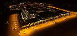 Die Terminalanlagen und die Flugsteige befinden sich in der Mitte zwischen beiden Start- und Landebahnen. Das Hauptgebäude ist 220 m breit, 180 m lang und 32 m hoch, seine Bruttogrundfläche beträgt 360.000 m².[48] Der Zentralbau hatte bei der Fertigstellung eine Kapazität von 30 Millionen Passagieren im Jahr. Es wurden im Endzustand 150.000 m³ Beton und 28.000 Tonnen Stahl verbaut.[49] Die Inbetriebnahme des Terminals 1 erfolgte am 31. Oktober 2020.[50]