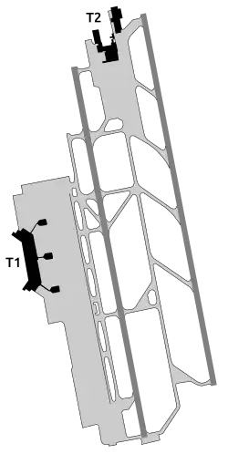 Im 1998 eröffneten, auf der Westseite gelegenen Terminal 1 mit seinen drei Satelliten werden nationale und internationale Linien- und Charterflüge abgewickelt. Das alte Nordterminal, jetzt Terminal 2 genannt, nutzen vorwiegend Billigfluggesellschaften. Die beiden Passagierterminals haben jeweils einen eigenen Flughafenbahnhof. Im Südwesten befindet sich ein Frachtterminal.