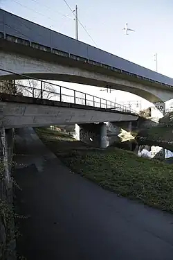 - ↑ Otto Schuwerk, Peter Raster: Brückenbauten der Flughafenlinie. In: Schweizer Ingenieur und Architekt (vorm. Schweizer Bauzeitung). 98. Jahrgang, Sammelband 1980 (digitalisierte Zeitschriften der ETH-Bibliothek), doi:10.5169/seals-74120, S. 533–537