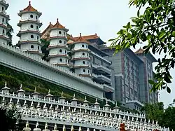 Nach der Durchquerung der Eingangshalle gelangt der Besucher in einen kleinen Park mit einem zentralen Weg, der auf den großen goldenen Buddha zuführt. Rechts uns links ist der Weg von je vier Pagoden gesäumt. Während der zentrale Stupa der Eingangshalle architektonisch im indischen Stil gehalten ist, sind die acht Pagoden im chinesischen Stil erbaut. Dies soll die historische Ausbreitung des Buddhismus von Indien nach China symbolisieren.[6] Die acht Pagoden stellen jeweils unterschiedliche Vorstellungen dar.[7]