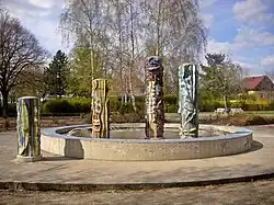 Der Brunnen Tanz der Jugend ⊙ befindet sich im Grünzug Pekrunstraße/Ecke Scheibenbergstraße in Marzahn. Das Werk des Künstlers Wolfgang Weber aus dem Jahr 1984 besteht aus einem runden Kunststeinbecken (⌀ 7,10 Meter), dessen Rand mit blau glasierten Keramikplatten belegt ist. Das Wasser strahlt aus Düsen, die halbkreisförmig in zehn Gruppen angeordnet sind, in flachen Bögen zur Mitte des Bassins. Ihre besondere Prägung erhält die Brunnenanlage durch vier unterschiedlich hohe, runde Säulen, den Sinnbildern der tanzenden Jugend. Drei Säulen stehen im Becken, eine außerhalb. Die Säulen haben einen Durchmesser von 0,70 Meter, ihre Höhen schwanken zwischen 1,60 und 2,50 Metern. Während das Becken schlicht gehalten ist, sind die Säulen aus vielfarbigen Keramikteilen geformt und dekorativ mit ornamentalen Motiven ausgeführt.[11] „Ganz DDR-Moderne in abstrakt-expressiver Keramik“ urteilt Ingeborg Ruthe in der Berliner Zeitung und schreibt weiter: „Die bunten Säulen stehen für sozialistische Lebensfreude und Leichtigkeit. Ideologische Schwergewichte fürwahr.“[5]