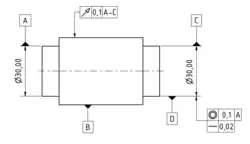 Die Achse der tolerierten Fläche muss in einem Zylinder (Ø = t), dessen Mittelachse koaxial zum Bezug ist, liegen.[Anm. 5] |