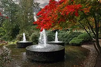 Die Anlage bietet die „Rhododendron- (Ericaceae) Schlucht“, einen Heidegarten, Pfingstrosen (Paeonia) sowie japanische Zierkirschen - und mannigfachen Azaleenarten wie Azalea pontica. Mit prächtiger Färbung des Fächer-Ahorn (Acer palmatum) und der Kuchenbäume (Cercidiphyllum) wartet der Herbst auf. Auch Bambus (Bambusoideae) ist vertreten. Auf einer 1,5 Hektar großen Waldfläche verteilt kann man nordamerikanische Bäume wie den Riesenmammutbaum (Sequoiadendron giganteum), die Gelbkiefer (Pinus ponderosa) und die Kolorado-Tanne (Abies concolor) entdecken. Im Zentrum der Anlage, am Seerosenbecken mit Wasserspielen, befindet sich ein pilzförmig gestalteter Unterstand als Treffpunkt und zum Wetterschutz. Verschiedene Themengärten wie zum Beispiel der Japanische Garten stellen einzelne Vegetationsregionen im Kontext vor.[2]