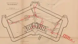 - 1900: Ersatz der drei Kaponnieren durch eine doppelte Grabenstreiche (coffre double) an der Spitze des Frontgrabens sowie je eine einfache Grabenstreiche (coffre simple) am Schulterpunkt des Frontgrabens mit den Flankengräben, Bau eines zusätzlichen Mannschaftsunterstandes für 80 Personen auf dem Hauptwall, Errichtung von zwei Zwischenraumstreichen (Casemate de Bourges) mit je einem Geschütz „Canon de 95“, Verstärkung der Kehlgrabenstreiche und des Pulvermagazins
