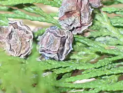 Beim Wacholder (Juniperus) werden einige Schuppen fleischig und es entsteht ein Beerenzapfen. Die Samenverbreitung erfolgt durch Vögel, die diese Früchte fressen und die Samen wieder ausscheiden.