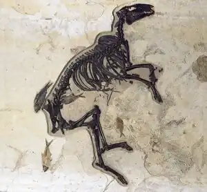 Säugetiere kommen bisher vergleichsweise selten vor, zeichnen sich aber ebenfalls durch überwiegend vollständige Skelette aus. Derzeit sind knapp zehn Gattungen bekannt, die mehrere große Formengruppen repräsentieren. Zu den Ferae, denen auch die heutigen Raubtiere angehören, werden einige Insekten fressende Formen gestellt. Dazu zählt unter anderem Palaeosinopa aus der Gruppe der Pantolesta, von dem drei nahezu vollständige Skelette überliefert sind, darunter das eines Jungtiers. Die Vertreter wurden insgesamt bis zu 1 m lang und lebten semiaquatisch als Beutegreifer in Gewässernähe, wodurch sie die ökologische Nische der heutigen Fischotter besetzten.[76][77] Bäume bewohnte dagegen Apatemys, ein Angehöriger der Apatotheria, das nur 35 cm lang wurde und sich durch stark verlängerte Mittelfinger analog zum Fingertier und einen extrem langen Schwanz auszeichnete, die sich hervorragend zum Klettern eigneten.[78] Ebenfalls in den Bäumen lebte ein bisher noch nicht genau bestimmter Vertreter der Cimolesta. Dieses ebenfalls langschwänzige Tier wies 45 Schwanzwirbel auf, eine hohe Anzahl, die heute nur von wenigen Säugetieren erreicht wird. Mit Hyopsodus, das zu den Condylarthra verwiesen wird, ist weiterhin ein, aufgrund der kurzen und kräftigen Beine grabend im Erdreich lebendes Säugetier bekannt. Daneben kommen zwei Vertreter der Unpaarhufer vor. Lambdotherium ist nur mit einigen fragmentierten Resten belegt, darunter einen Schädel. Es stellt einen kleinen Vorgänger der Brontotheriidae dar, die im Mittleren und Oberen Eozän ihre Blüte erlangten. Nahe verwandt ist Protorohippus, ein Urpferdchen, dass über eines der vollständigsten Skelette früher Angehöriger dieser Gruppe verfügt, wobei der Schädel etwa 15 cm lang ist.[79]