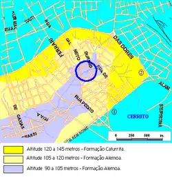 Das kreisförmig umrandete Gebiet umfasst neun Hektar, es wird ab der Straße Osvaldo Aranha bis hin zur Avenue Fernando Ferrari von dem Bach Cancela, einem Arroyo, durchflossen. Der Bach hat das anstehende rote Sedimentgestein freigelegt und somit den Zugang zu den Fossilien ermöglicht. Die jeweiligen Fossilfundstellen sind als Punkte 1, 2 und 3 in Abbildung 2 aufgeführt. Zur Dimensionierung: die Strecke von Punkt 1 bis Punkt 3 beträgt 185 Meter, die Strecke von Punkt 3 bis zur Straße Otavio Alves de Oliveira misst 142 Meter.