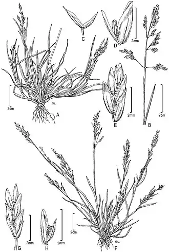 A–E Poa annua L. A Habitus B Blütenstand C glumes D Einzelblüte mit Vorspelze und Staubbeuteln E Einzelblüten F–H Poa infirma Kunth F Habitus G Ährchen H Einzelblüte mit Vorspelze und Staubbeuteln Zeichnungen von Soreng (2007). | ||||||||||||