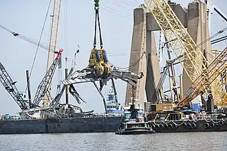Ein riesiger Greifer mit einem Eigengewicht von 165 Tonnen und einer Tragfähigkeit von 1000 Tonnen wurde am vorletzten Aprilwochenende an die Einsturzstelle gebracht. Dieses Gerät eines niederländischen Herstellers hat vier hydraulisch betriebene Greifarme und ist in seiner Art eines der größten der Welt. Am „Chesapeake 1000“ hängend, wird es benutzt, um schwere Beton- und Stahltrümmer nach der Schließung des für fünf Tage geöffneten Behelfskanals vom Flussgrund zu heben und die ursprüngliche Tiefe der Hauptfahrrinne von 50 Fuß wieder herzustellen.[40]