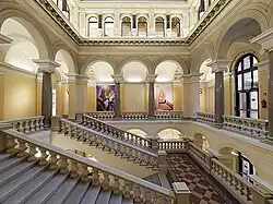 Ende 1892 waren die Bauarbeiten weitgehend abgeschlossen. Im Januar 1893 begann die Aufstellung der Sammlungen. Der Entwurf des 110 Meter langen Figurenfrieses aus Stotzinger Sandstein stammt von Melchior zur Strassen aus Leipzig, die Ausführung besorgte Rudolf von Cöllen aus Leipzig. Das Werk visualisiert die Geschichte Oberösterreichs seit der Keltenzeit bis zu den Habsburgern. Das monumentale Treppenhaus im Innern öffnet sich bis zur gläsernen Kuppel. Franz Attorner malte in den Lünetten die vier Viertel des Landes Oberösterreich.