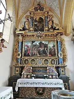 Das Altarbild besteht aus drei Tafeln, auf welchen die heilige Sippe, der heilige Christophorus und die heilige Apollonia dargestellt sind. Die beiden letzteren auf den Seitenflügeln dargestellten Heiligen lassen auf die Auftraggeber schließen, den Kaiserlichen Feldhauptmann Christoph Frangipani und seine Frau Apollonia Lang von Wellenburg. Auch bei den Figuren der Heiligen Sippe auf der Mitteltafel könnte es sich um Porträts von Mitgliedern der Stifterfamilie handeln.[1]