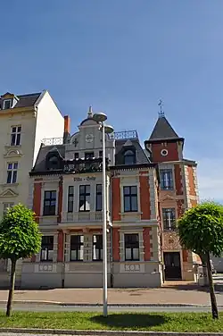 Die Fassade ist sehr aufwändig im Stil der Neorenaissance gestaltet. Roter Backstein und heller Putz prägen das Bild. Die Gebäudekanten sind rustiziert. Die Mittelachse wird durch einen durch Pilaster gegliederten Erker im Obergeschoss betont, der von einem Zwerchgiebel mit drei Obelisken gekrönt wird.