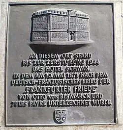 Ort der Unterzeichnung war das Hotel zum Schwan im Steinweg, an dessen Stelle heute die Buchhandlung Hugendubel steht. Für das Deutsche Reich bevollmächtigte Verhandlungsführer waren Fürst von Bismarck und Graf von Arnim, für die Französische Republik Jules Favre, Augustin Pouyer-Quertier und Marc-Eugène de Goulard. Nach der Annexion Frankfurts 1866 durch Preußen war das Verhältnis der Stadt zum Königreich sehr angespannt. Bismarck versuchte, den Frieden von Frankfurt auch für dieses Verhältnis positiv zu nutzen. Er sagte nach dem Friedensschluss: „Ich wünsche von Herzen, daß der Friede von Frankfurt auch den Frieden für Frankfurt und den Frieden mit Frankfurt bringen werde.“[8]