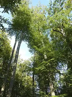 Seit dem 19. Jahrhundert gibt es Aufzeichnungen über Waldschäden, vor allem durch Naturereignisse. Im 19. und frühen 20. Jahrhundert ereigneten sich etwa in jedem zweiten Jahr Spätfröste, die den Wald schädigten. Besonders am 27. Mai 1858 und am 18. Mai 1871 erfroren jeweils alle Jungbäume und die meisten Altbäume bis zum Wipfel.[40] Vereinzelte Berichte über schwere Sturmschäden stammen bereits aus den Jahren 1491, 1606 und 1685. Ab dem 18. Jahrhundert gibt es genauere Aufzeichnungen, die belegen, dass etwa alle 10 bis 15 Jahre größere Stürme oder Orkane auftreten. Besonders schwere Schäden verursachten der sogenannte Jahrhundertsturm am 15. Februar 1833, der Orkan am 12. und 13. März 1876, bei dem mit etwa 30.000 Festmetern ungefähr das Doppelte des normalen Holzeinschlages eines Jahres fiel, der Südweststurm am 6. Oktober 1901 mit etwa 20.000 Festmetern[41] sowie in neuerer Zeit der Orkan Wiebke am 28. Februar 1990.