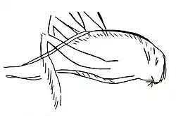 Zeichnungen sind die am häufigsten erhaltene Art figürlicher Darstellung. Vor allem als Gravuren (die am häufigsten angewandte Technik)[46] wurden sie mit spitzem Steingerät an Decken und Wänden angebracht. Die Umrisslinie mit Zeichenkohle gilt als eine der wichtigsten Erfindungen der frühen Kunst.